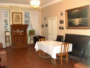 Из коридора переходим в гостиную. Здесь сохранился большой раздвижной обеденный стол и красивый полубуфет, а также диван и 2 кресла, стоявшие при Павлове. Картины одного из учеников Куинджи, а также Ю.Ю. Клевера и И. Петрова принадлежали Павлову, хотя поступили они в музей только в 1995 году.