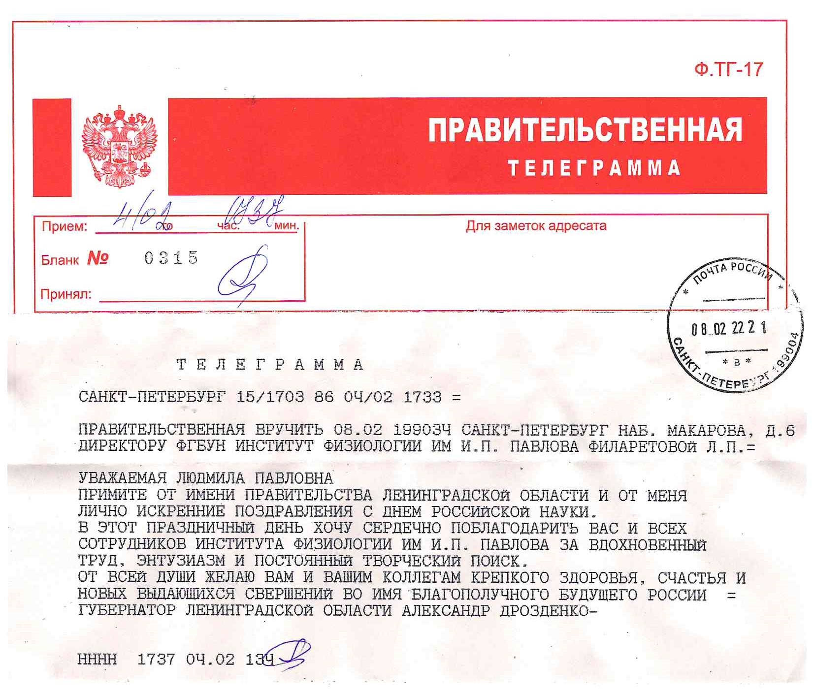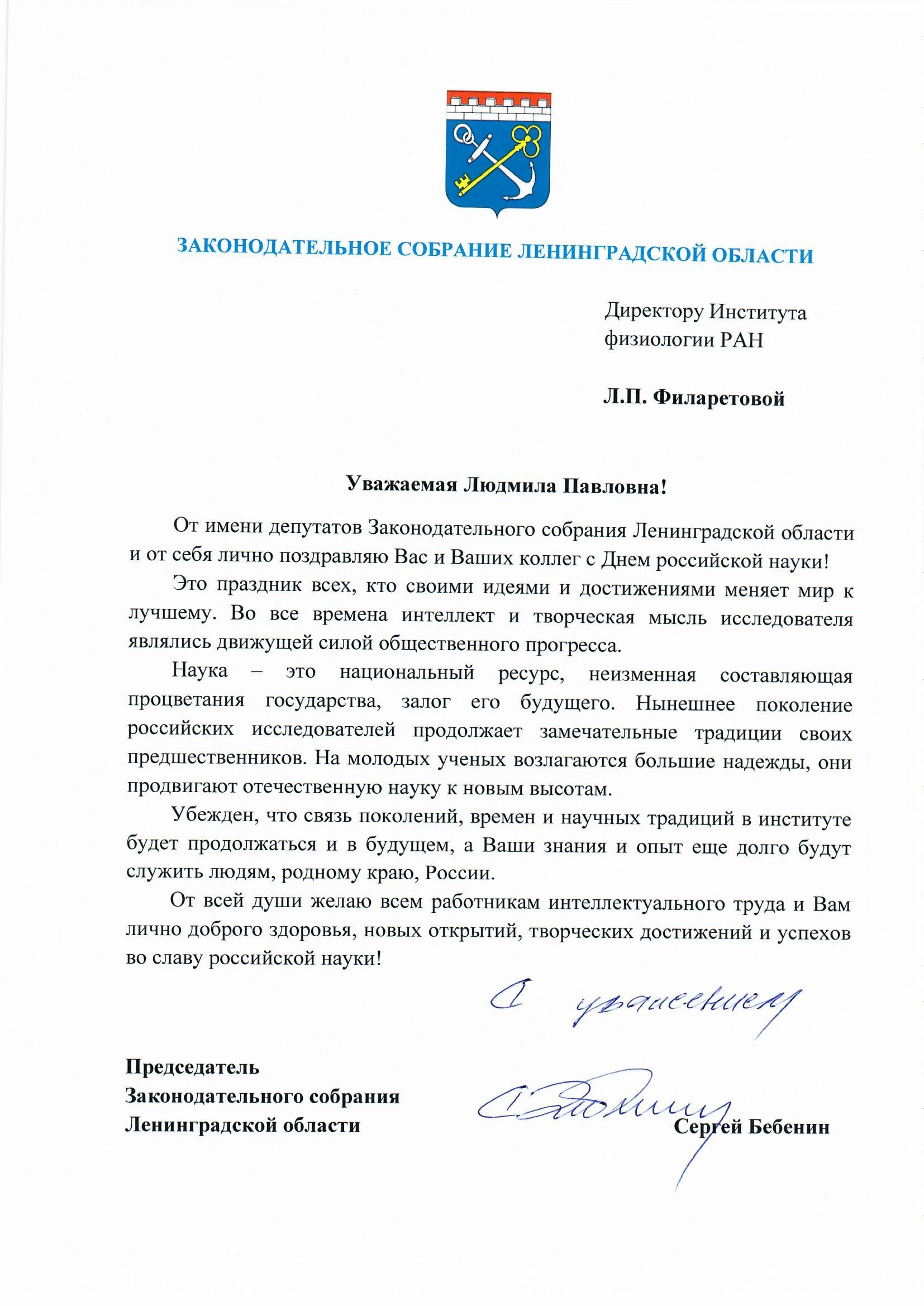 В адрес Института физиологии им. И.П.Павлова РАН пришли правительственные поздравления с Днем науки: от губернатора Ленинградской области А.Ю.Дрозденко и от имени депутатов Законодательного собрания Лениниградской области от председателя ЗакСа С.А.Бебенина>>
