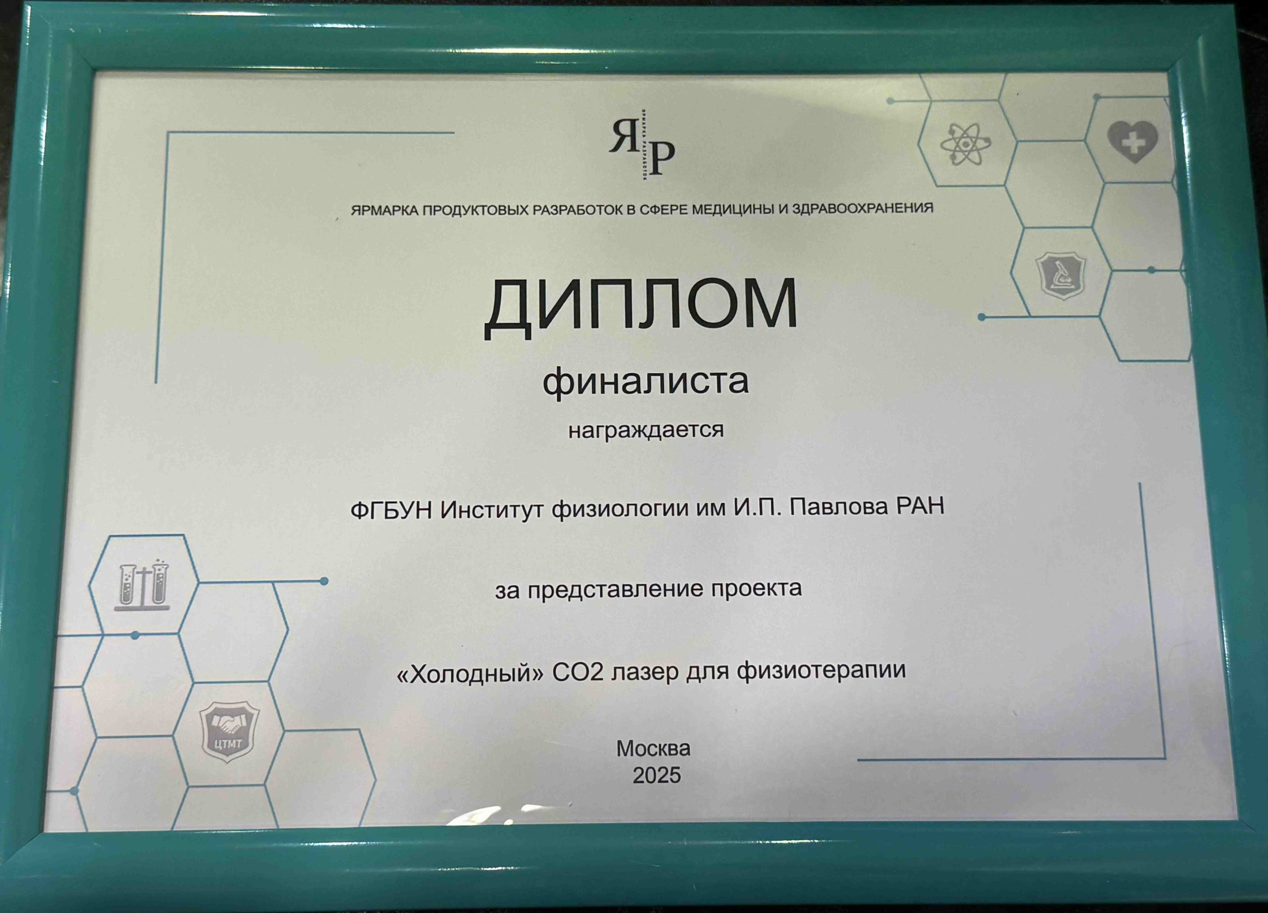 проекта «Холодный» CO2 лазер для физиотерапии» с очным докладом в рамках «Ярмарки продуктовых разработок в сфере медицины и здравоохранения», проходившей 29 – 30 октября в Москве. «Ярмарка разработок», на которую в 2025 году было заявлено 160 проектов, подтвердила статус уникального межотраслевого мероприятия, предоставляющего площадку для взаимодействия между учреждениями различной ведомственной принадлежности, осуществляющими исследования и разработки в сфере медицины и здравоохранения, и потенциальными индустриальными партнерами.
