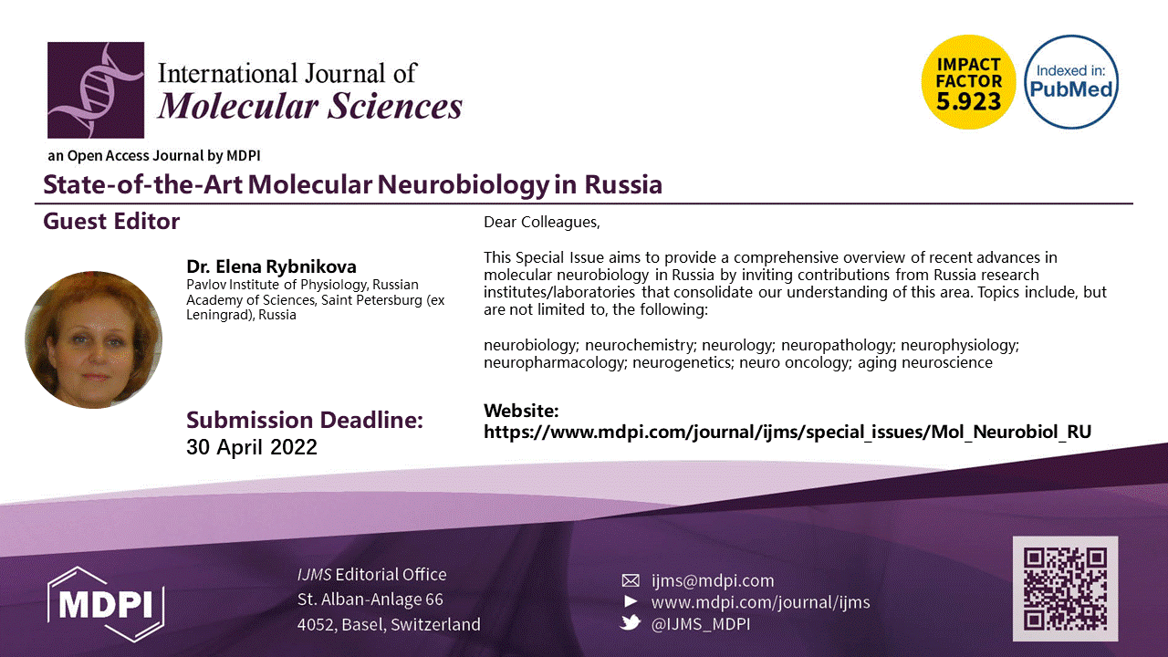 Уважаемые коллеги! Приглашаем Вас опубликовать статьи в специальном выпуске журнала International Journal of Molecular Sciences (IF- 5,923, WoS Q1) «State-of-the-Art Molecular Neurobiology in Russia»