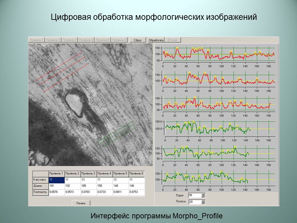 В 90-е годы при лаборатории был создан центр обработки изображений, на базе которого были решены задачи цифровой обработки изображений различных биологических объектов. Например, проводился морфометрический анализ скоплений нейронов зрительных полей коры мозга кошки, осуществлялся ввод изображений отдельных нервных сплетений для измерения площади рецепторных полей, длины волокон и т. п. В настоящее время продолжается разработка программ для интерактивной цифровой обработки морфологических изображений (выделение областей интереса в интерактивном режиме и расчет их оптико-геометрических характеристик) (слайд 10) .