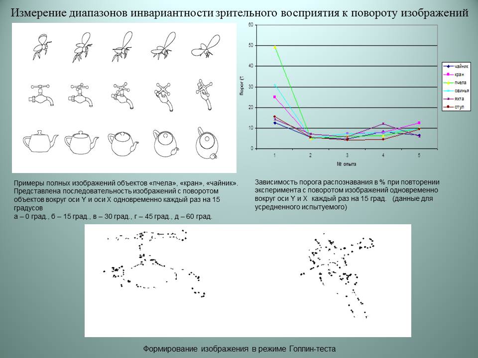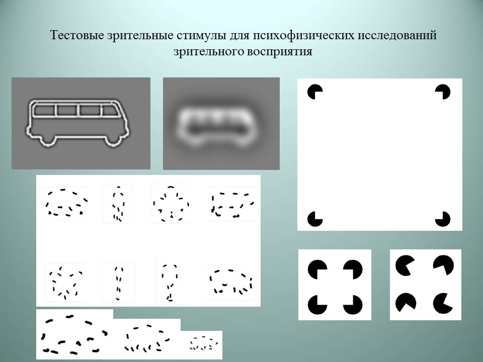 В лаборатории длительное время совместно с лабораторией физиологии зрения выполняется работа по организации и проведению компьютеризированных психофизиологических экспериментов по исследованию механизмов зрительного восприятия. Реализован ряд программ синтеза и предъявления изображений-стимулов с задаваемыми параметрами, проведения экспериментов, накопления и анализа данных по исследованию механизмов пространственного зрения, восприятия неполных изображений, краудинг-эффекта и др. (слайд 11, слайд 12, слайд 13).