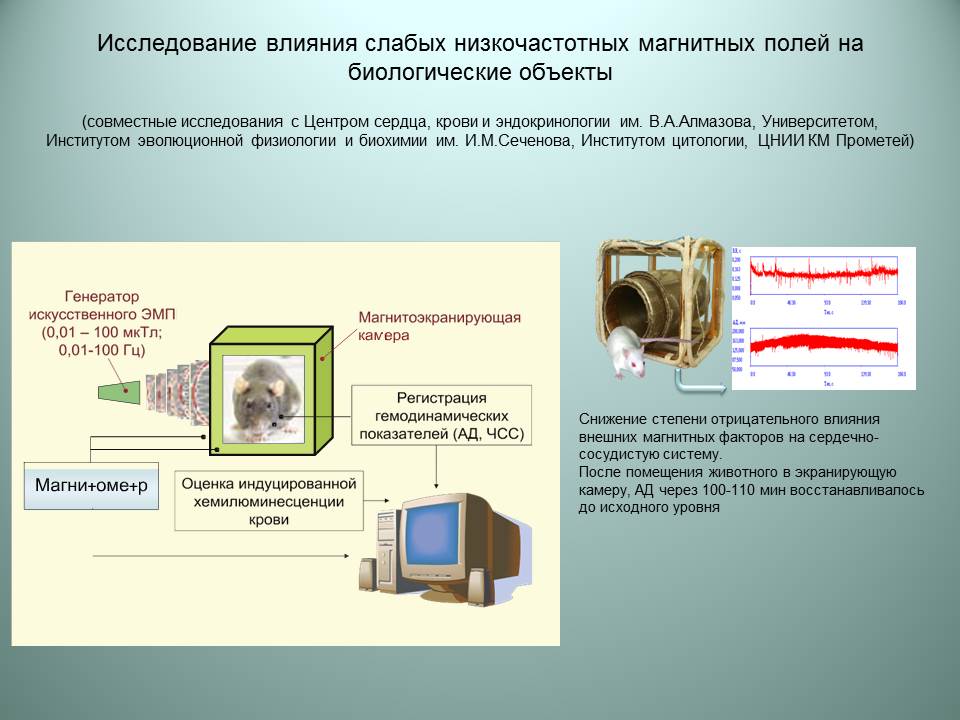 В лаборатории выполняются разработки методических средств для исследования влияния слабых низкочастотных магнитных полей на биологические объекты различной степени сложности (слайд 15). Выполнен расчет и изготовление экранирующей камеры для растительных объектов и клеток, проводилась работа по исследованию механизмов влияния сверхслабых магнитных полей на компоненты крови и возбудителей инфекционных заболеваний, исследовалось влияние сверхслабого статического магнитного поля на снижение активности развития возбудителей инфекционных заболеваний (по договорам о сотрудничестве с ИЭФБ РАН, ФГУ ФЦСКЭ им. В.А. Алмазова, ФГУП ЦНИИ КМ «Прометей», СПГУ).