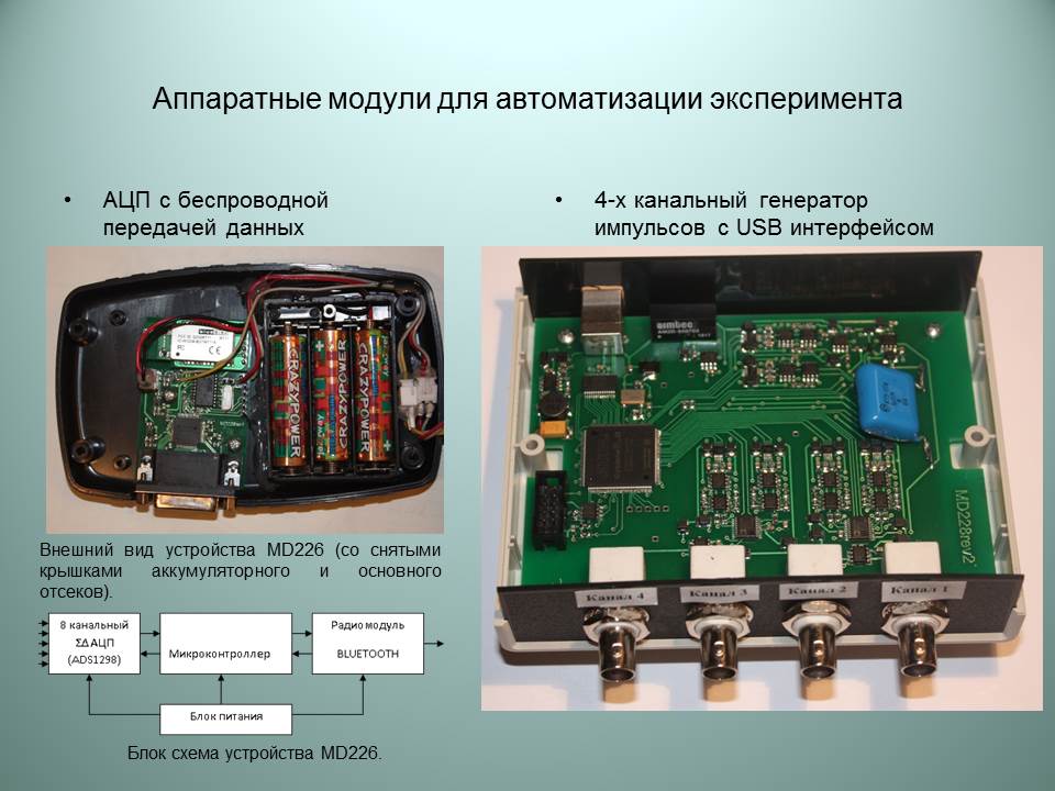 Устройство MD228 представляет собой программируемый четырехканальный генератор импульсов (слайд 7). Устройство MD236 предназначено для контроля изменения частоты импульсной активности нейронов при воздействии на биологический объект. На базе устройства MD236 проведение экспериментов по исследованию фармакологии синаптической передачи в рецепторах вестибулярного аппарата лягушки (слайд 8). Устройство MD245 предназначено для использования в системе оценки функционального состояния дыхательных мышц человека (слайд 9). Цифровая часть устройства выполнена на микросхеме CPLD EPM570T100C5 (Altera). Устройство имеет две основных функции: снятие показаний с датчика давления, встроенного в прибор для медико-физиологических исследований дыхания, передача данных в компьютер, а также управление электромагнитным клапаном перекрытия воздушного потока.