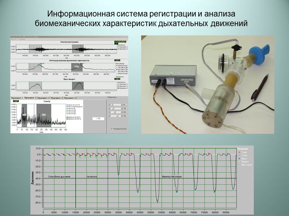 Программная поддержка разработанных устройств организована с помощью драйверов, а также dll-библиотек, написанных для среды C ++ и Delphi и включающих функции верхнего и нижнего уровня. В среде Delphi с использованием DirectX разработаны программы контроля аппаратуры, обработки и визуализации сигналов, управления экспериментом в диалоговом режиме. Например, программа для оценки функционального состояния дыхательных мышц пациента обеспечивает отображение регистрируемого давления во времени, определение различных временных параметров дыхательного цикла, вычисление индекса функционального состояния инспираторных мышц. Оцифрованные процессы сохраняются в реляционной базе данных. Программа включает процедуры фильтрации, изменения масштаба осей и т.п. Реализован экспорт данных в Excel .