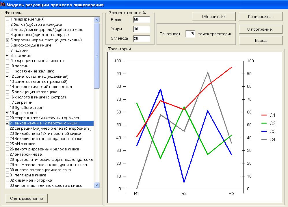 - Разработка (совместно с лабораторией физиологии пищеварения) модели процесса пищеварения, воспроизводящей структуру взаимодействий нейрогормональных, секреторно-ферментативных и транспортных процессов и исследование с ее помощью процессов пищеварения у собак.