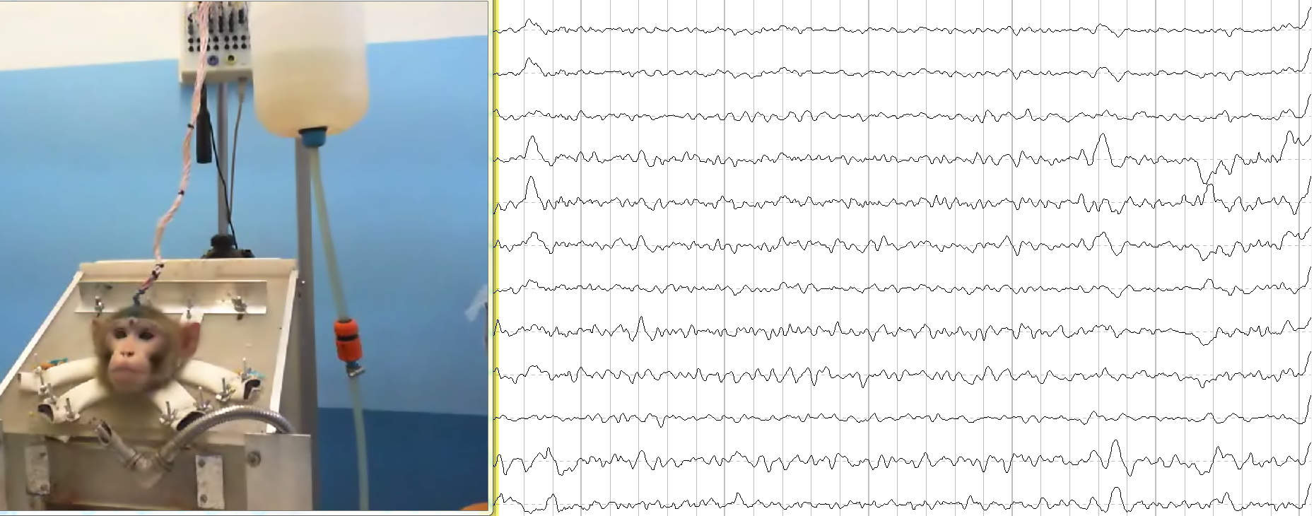 В электрофизиологических экспериментах сотрудники группы анализируют электрокортикограмму — биоэлектрический сигнал, отводимый непосредственно с поверхности коры больших полушарий мозга приматов. Постановка электродов проводится с учетом данных компьютерной и магнитно-резонансной томографии. В результате проведенных экспериментов выявлены специфические признаки в электрокортикограмме, соответствующие различным состояниям животного, таким как наркоз, сон, спокойное бодрствование, состояние эмоционального возбуждения. Изучены характеристики зрительных вызванных потенциалов на вспышку и слуховых вызванных потенциалов в парадигме выявления волны негативности рассогласования, позволяющей оценивать не только функциональное состояние слухового анализатора, но и функции непроизвольного внимания. Зарегистрированы когнитивные вызванные потенциалы и изучены изменения мощности отдельных ритмов мозга обезьяны во время решения задач различной сложности.
