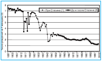 С 1925 по 2000 год коэффициент суммарной рождаемости в России снизился на 5,59 ребенка в расчете на одну женщину (с 6,80 до 1,21) (рис.2.). Из них 3,97 ребенка, или 71% общего снижения приходится на 1925-1955 годы - "сталинскую эпоху".