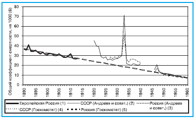 Во-первых, смертность снижалась уже до революции, поэтому ее умеренное снижение никак нельзя было отнести к заслугам советской власти. Более того, показатели смертности в 1930-е годы были существенно выше, чем можно было ожидать при сохранении предреволюционных тенденций - все они находятся выше линии тренда 1890-1913 годов (см. рис. 3).