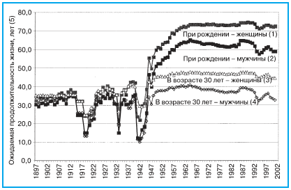 Как показал Е. Андреев (рис. 4), даже если брать только наиболее благоприятные, "бескризисные" годы межвоенного периода, ожидаемая продолжительность жизни женщин поднялась заметно выше предреволюционного уровня (примерно на 45 лет), но у мужчин никакого роста по сравнению с последними предреволюционными годами практически не было. Положение изменилось только после войны, и к 1953 году ожидаемая продолжительность жизни и мужчин, и женщин превышала лучшие предвоенные показатели примерно на 20 лет. Однако этот успех был достигнут в основном за счет снижения смертности в детских возрастах, что, в свою очередь, объяснялось появлением и массовым внедрением в практику антибиотиков. А вот рост ожидаемой продолжительности жизни взрослого населения был намного более скромным и кратковременным, он очень скоро прекратился, а у мужчин впоследствии даже сменился сокращением продолжительности жизни.