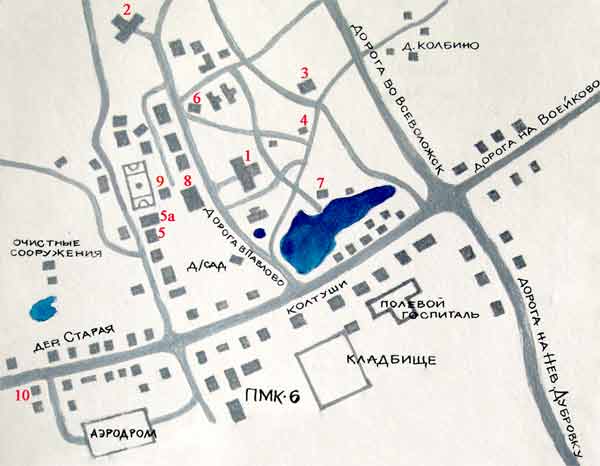 1 - главный (I-й) корпус института; 2 - II-й лабораторный корпус; 3 - бывший дом директора (штаб 30 ГСК); 4 - здание, в котором работал И.П. Павлов; 5а, 5 - старое здание школы (госпиталь); 6 - детский сад; 7 - здание института (не сохранилось); 8 - бывшие мастерские; 9 - муз. школа (во время ВОВ - бани и прачечные); 10 - правление колхоза (штаб 45 ГСК).
